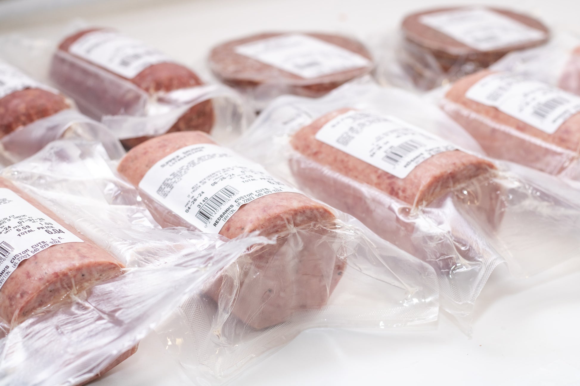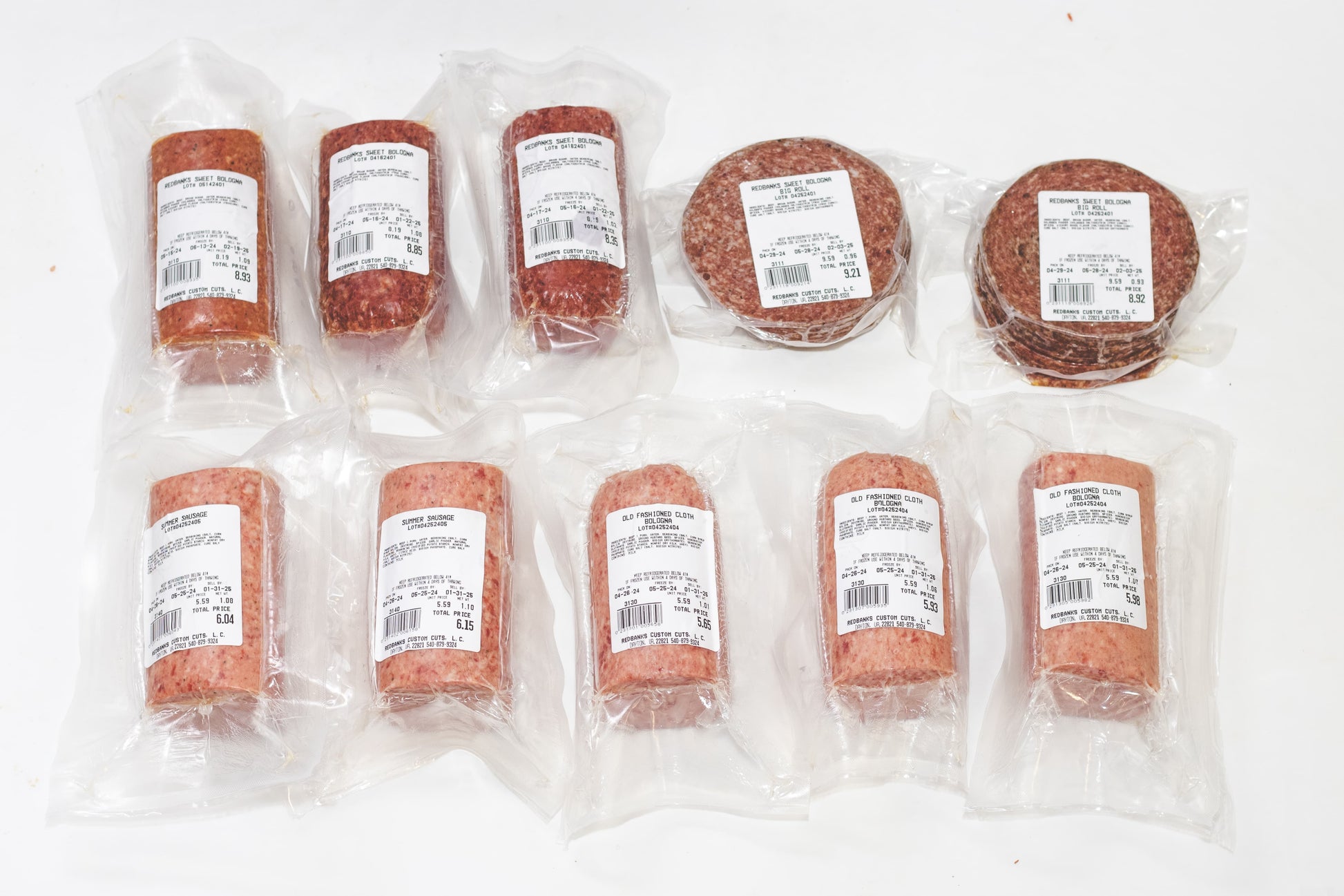 Indulge in classic meats with the Bologna Box. Enjoy 3 1-pound packs of Redbanks Sweet Bologna, 3 1-pound packs of Old Fashioned Cloth Bologna, 2 1-pound packs of Summer Sausage, and 2 1-pound packs of sandwich-size Redbanks Sweet Bologna slices. Approximately 10 pounds of savory goodness.