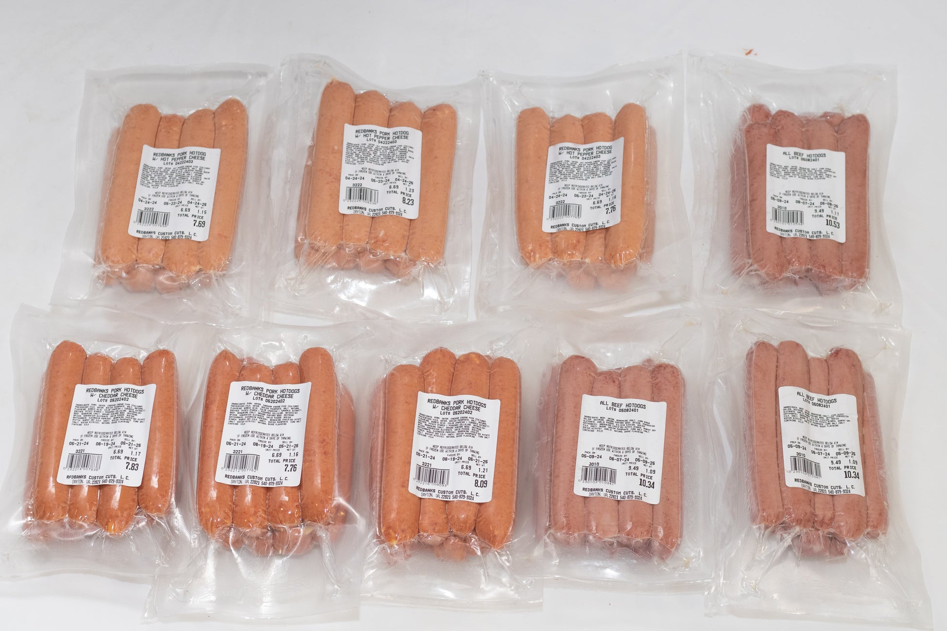 Embrace the thrill of the grill with the Hotdog Box! This bold package includes 3 packs of All Beef Hotdogs, 3 packs of Pork Hotdogs with Cheddar Cheese, and 3 packs of Pork Hotdogs with Hot Pepper Cheese, totaling up to approximately 10 pounds. Get ready to embark on a flavor adventure!